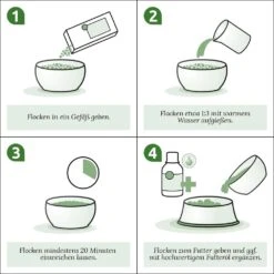 Die Flocken bitte 20 Minuten vor der Fütterung mit etwas Wasser oder Brühe anrühren und mit hochwertigem Frisch- oder Dosenfleisch vermischen – das ergibt eine wohltuende und leckere Mahlzeit. Empfehlenswert ist auch die Zugabe einer Vitamin-Mineralstoffmischung.