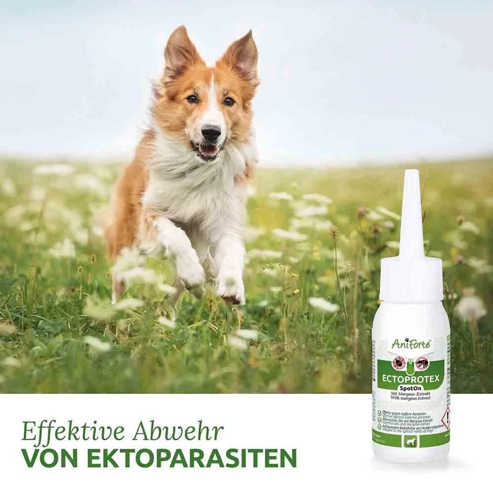 Aufgrund der milder werdenden Wintermonate wird die Abwehr von unerwünschten Insekten ein ganzjähriges Thema, mit dem sich Hundebesitzer auseinandersetzen müssen. Unser Kompetenz-Team hat die Zusammensetzung der Tropfen speziell auf die Bedürfnisse Deines Hundes abgestimmt. Das Spot on für Hunde wurde fachkundig kreiert, um Ihrem Liebling nicht zu strapazieren durch das Flohmittel. Hunde können das ganze Jahr über mit Ektoparasiten zu kämpfen haben, deshalb empfehlen wir für eine optimale Wirkung das AniForte® Ectoprotex Flohmittel Hund ganzjährig anzuwenden.