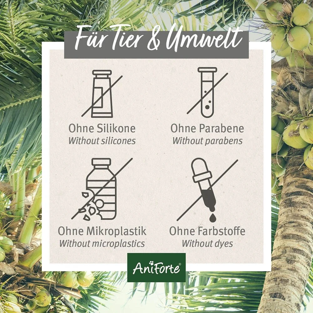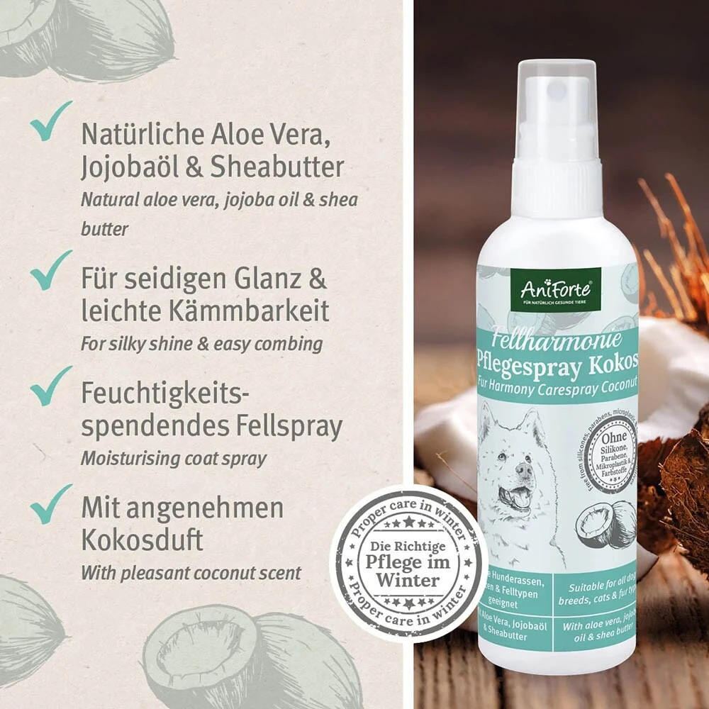 AniForteÂź Fellharmonie Pflegespray Kokos eignet sich fĂŒr alle Hunde- und Katzenrassen â doch speziell bei langhaarigen Tieren gestaltet sich die Fellpflege manchmal schwierig: Die Haare verfilzen, bilden Knoten und lassen sich nicht mehr schmerzfrei kĂ€mmen. Die Lösung fĂŒr verfilztes Haar ist das Fellspray, welches leistungsstarke und natĂŒrliche Inhaltsstoffe wie Aloe Vera, Jojobaöl und Sheabutter mit einem angenehmen Duft nach frischen KokosnĂŒssen vereint. Dadurch wird die Verfilzung Ihre Lieblings auf pflanzliche Weise entwirrt und die Haut mit Feuchtigkeit versorgt, um Juckreiz entgegenzuwirken.
