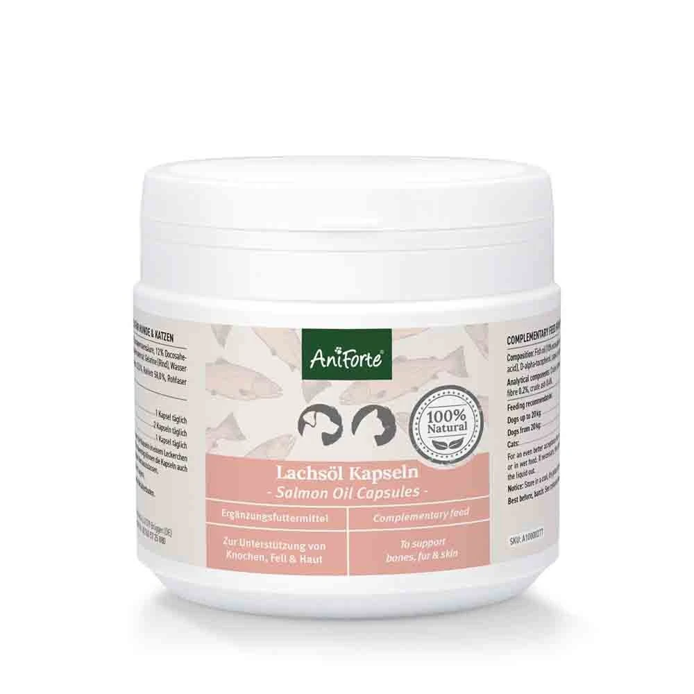 AniForteÂź Lachsöl Kapseln versorgen Ihren Vierbeiner mit natĂŒrlichen und reinen NĂ€hrstoffen und tragen zu einer vollwertigen ErnĂ€hrung bei.
