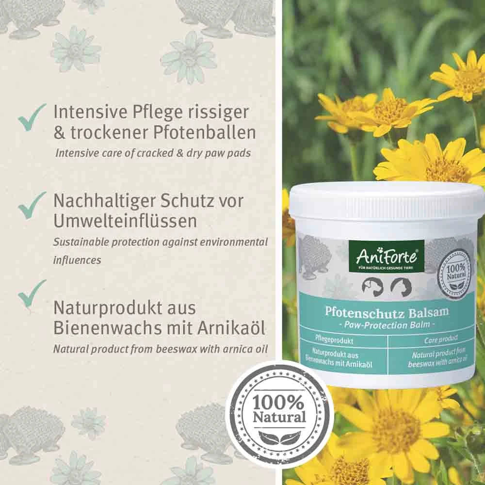 Durch starke Beanspruchung können sensible Hundepfoten austrocknen und rissig werden. AniForte® Pfotenschutz Balsam pflegt empfindliche Hunde- und Katzenpfoten auf rein natürliche Weise.