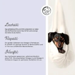 Enthält natürliche Omega-Fettsäuren, eine Vielzahl von Vitaminen und Mineralien, die sich positiv auf Haut, Fell, Immunsystem, Verdauung und Stoffwechsel der Vierbeiner auswirken.