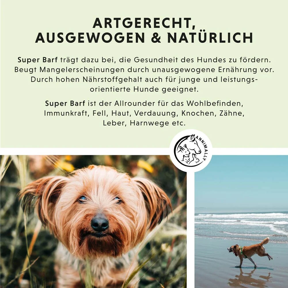 Das Super Barf unterstĂŒtzt die ausgewogene ErnĂ€hrung des Vierbeiners und setzt dabei ausschlieĂlich auf natĂŒrliche Inhaltsstoffe. Auf diese Weise wird sichergestellt, dass der Hund optimal und artgerecht versorgt wird.