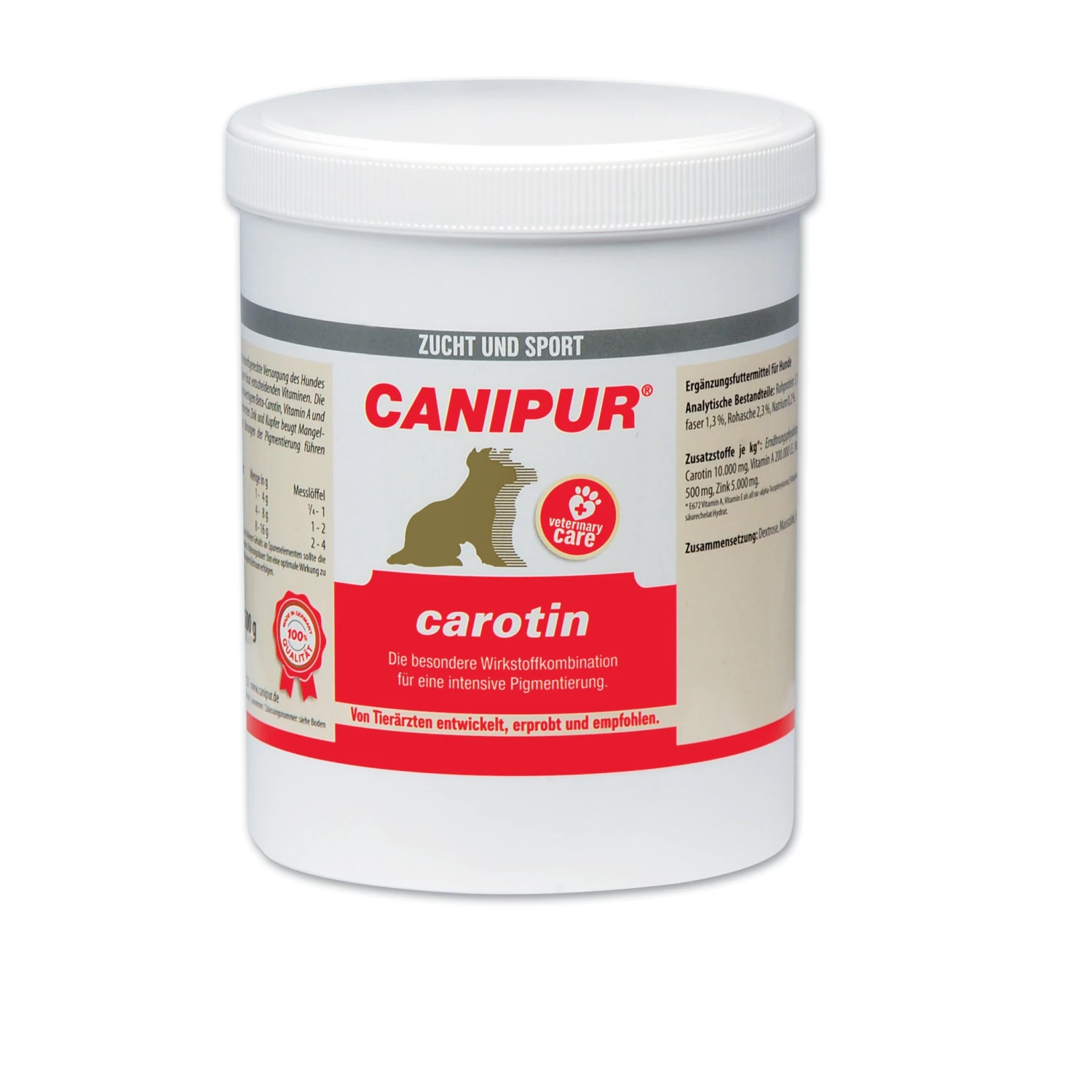 CANIPUR – carotin bietet eine bedarfsgerechte Versorgung des Hundes mit den für die Pigmentierung der Haut entscheidenden Vitaminen. Die tägliche Gabe von biologisch hochwertigem Beta-Carotin, Vitamin A und Vitamin E sowie den Spurenelementen Zink und Kupfer beugt Mangelerscheinungen vor, welche zu Störungen der Pigmentierung führen können.