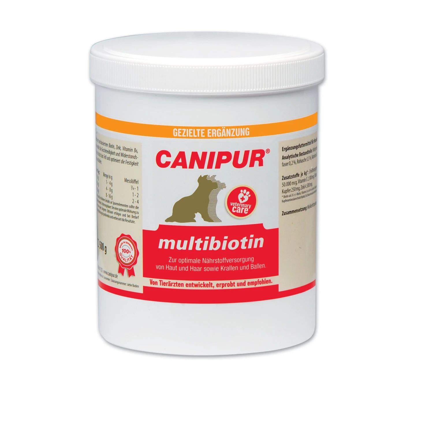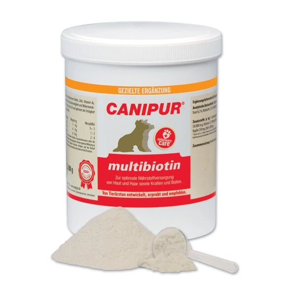 CANIPUR – multibiotin mit hochdosiertem Biotin, Zink, Vitamin B6, Vitamin E und Fettsäuren erhöht die Geschmeidigkeit und Widerstandskraft der Haut, kräftigt und schützt das Fell und optimiert die Festigkeit und Elastizität der Krallen und Ballen.
