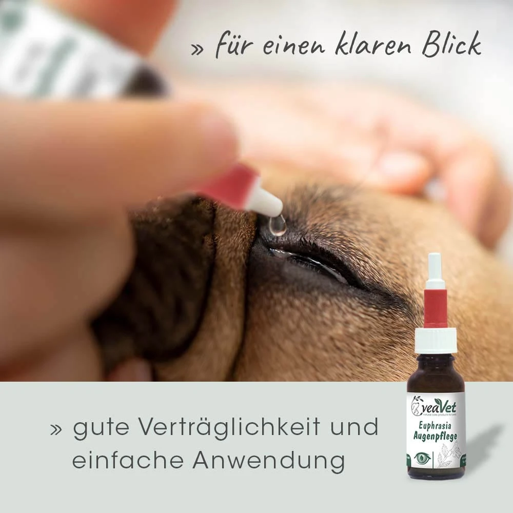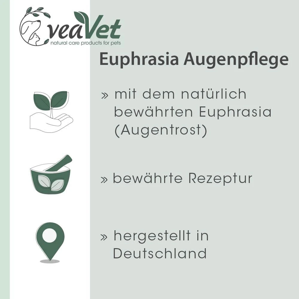 VeaVet Euphrasia Augenpflege sorgt durch ihre spezielle Rezeptur mit den natürlichen Bestandteilen des Augentrosts (Euphrasia) für eine schonende und effektive Reinigung der Augenumgebung. Gute Verträglichkeit und einfache Anwendung. Schmutz und Verkrustungen werden auf natürliche Weise von den Augenlidern und der Augenumgebung gelöst.