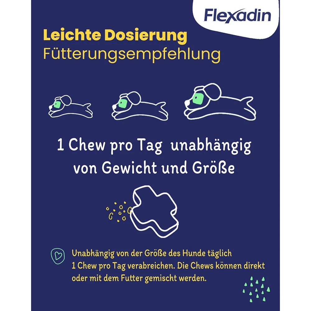 Die ebenfalls enthaltenen Omega-3-Fettsäuren und Vitamin E haben einen zusätzlichen positiven Effekt auf die Gelenke. Flexadin® Adult Dog ist en leckerer Chew, der ganz einfach wie ein Hundeleckerli jeden Tag gegeben werden kann. Ganz ohne Zwang! Die Dosierung ist unkompliziert: Jeder Hund erhält unabhängig von Gewicht und Größe 1 Stück pro Tag.